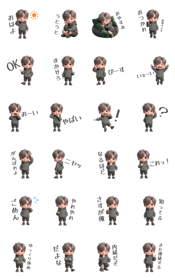 | スタンプ説明 | 3Dのぷにぷに質感がかわいい、ダークカラー男子の日常スタンプです。恋人/カップル/ペア/友達/家族/挨拶/男の子/クール/モノトーン/パーカー/淡色女子シリーズ |