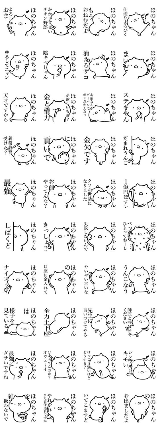 | スタンプ説明 | その他【○○に送る煽りまくるスタンプ】【しこたま激しいねこ】【豆猫】【豆ペン】【かわいい煽りうんこ】【ウザいお猿】【煽りウサギ】【ウザいパグ】シリーズも発売中☆ |