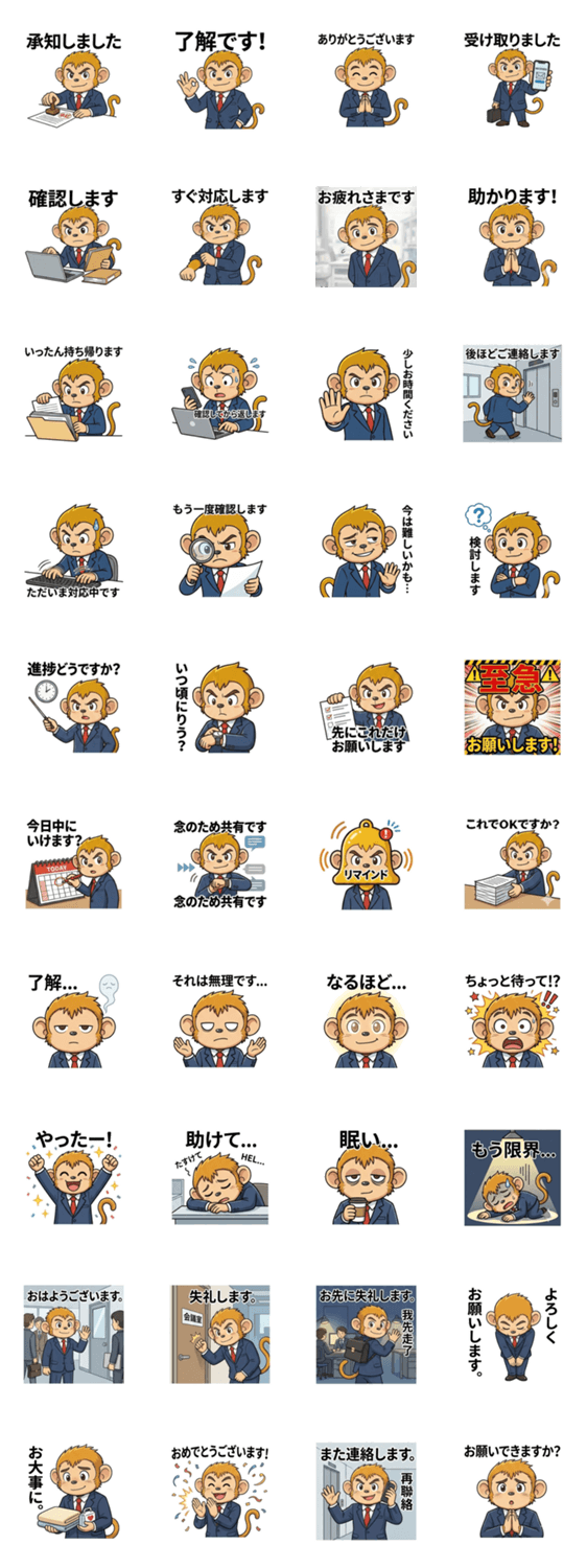 | スタンプ説明 | 既読でも焦らない。課長猴悟空が職場で使える「安全ワード」40連発!受領・保留・催促・リアクション・挨拶まで、これ一個で会話が回る。 |