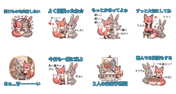 | スタンプ説明 | 不器用だけど優しいうさぎと、愛情たっぷりなきつねのカップル。リアルな恋人の日常や気持ちをそのまま表現します。 |