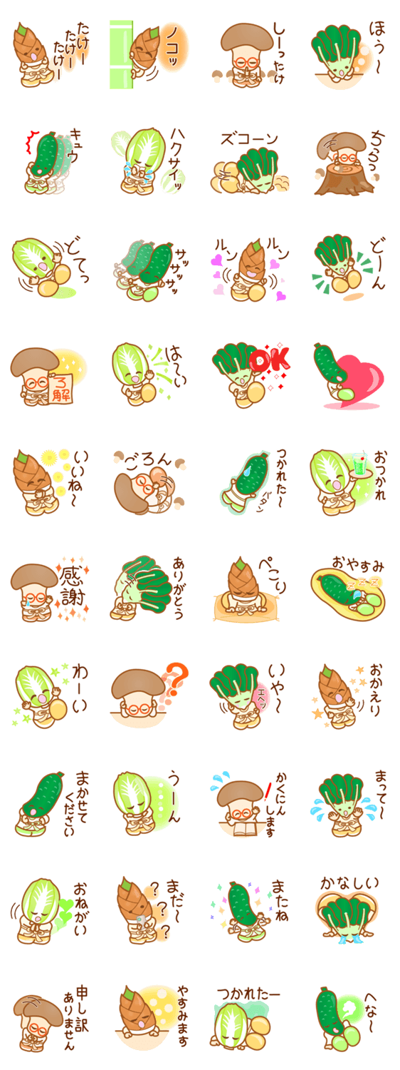 | スタンプ説明 | ☆元気で明るい☆グルメスタンプです。きのこ・たけのこ・白菜・ほうれん草・キュウリ |
