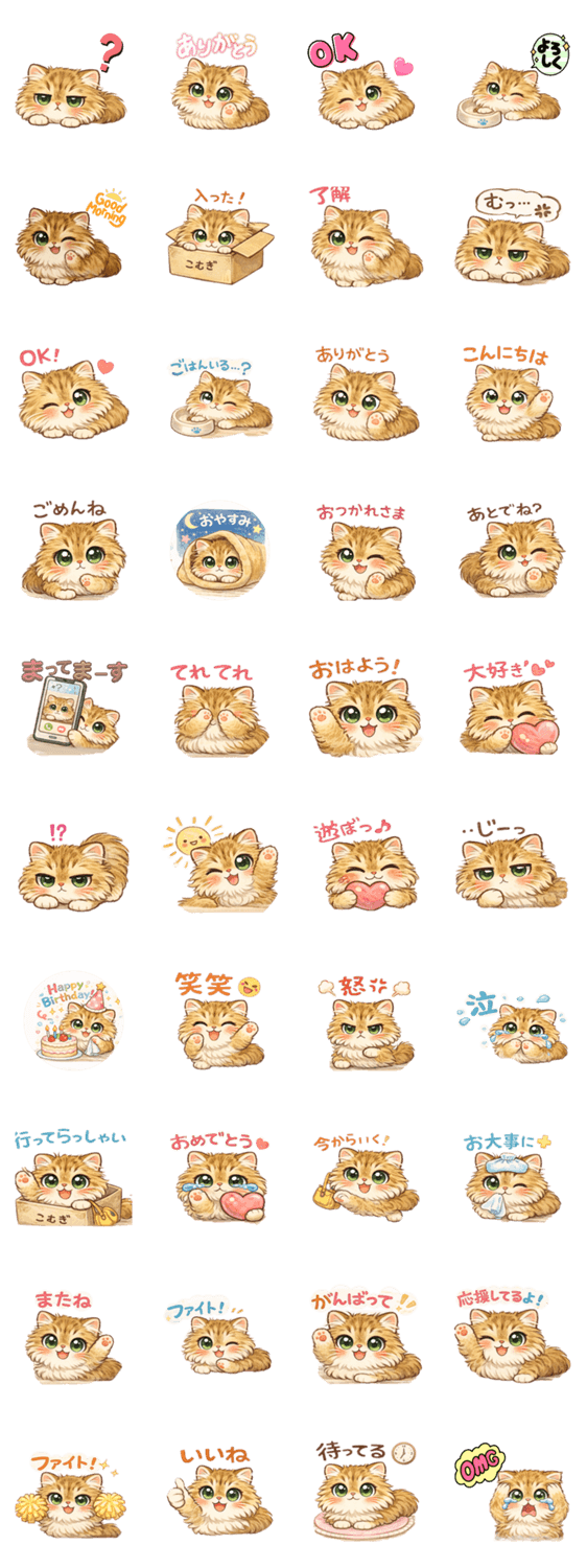 | スタンプ説明 | こむぎの かわいい猫スタンプです。 毎日使えるあいさつやリアクションがいっぱい。猫好きさんにおすすめの 日常スタンプです。 |
