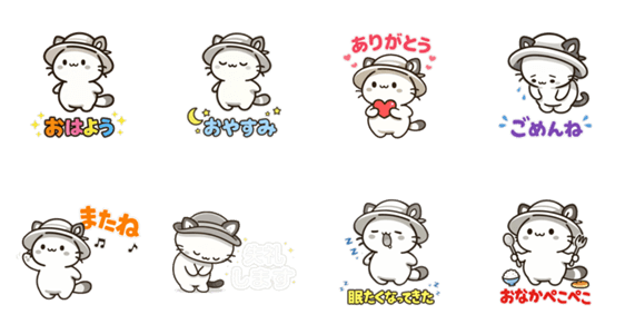 | スタンプ説明 | Meet a cute white cat in a gray bucket hat, sharing daily greetings in a bright Japanese pop style. Bring kawaii charm and fun energy to your chats. |