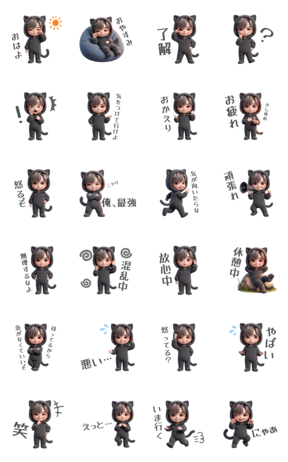 | スタンプ説明 | 3Dのぷにぷに質感がかわいい、ダークカラー男子の黒ねこ日常スタンプです。恋人/カップル/ペア/友達/家族/挨拶/男の子/クール/モノトーン/動物/もふもふ/淡色女子シリーズ |