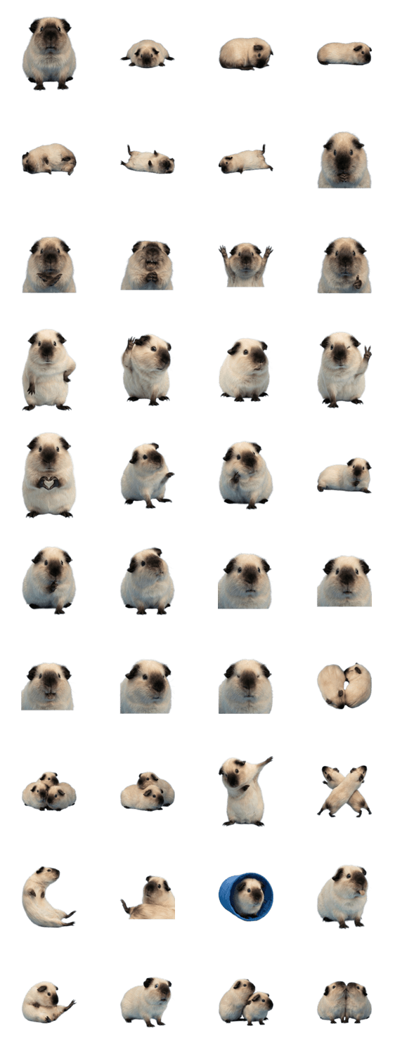 | スタンプ説明 | ロシアンスモーク鼻先が黒くて可愛い天竺鼠の表情豊かな動物写真。もふもふ小動物癒やしシュール面白い日常会話ペット本物個性的かわいいゆるい家族友達仕事お祝い人気綺麗 ※このスタンプはトークルームで大きく表示されるBIGスタンプです。 |