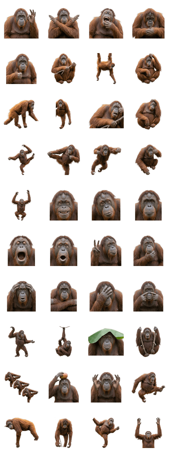 | スタンプ説明 | ボルネオスマトラ賢くて可愛い類人猿の表情豊かな動物写真。森の賢者野生動物癒やしシュール面白い日常会話本物迫力個性的かわいいゆるい家族友達仕事お祝い人気綺麗自然珍 |