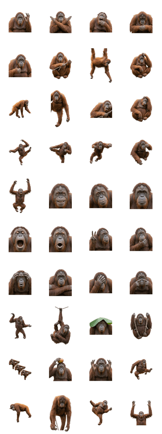 | スタンプ説明 | ボルネオスマトラ賢くて可愛い類人猿の表情豊かな動物写真。森の賢者野生動物癒やしシュール面白い日常会話本物迫力個性的かわいいゆるい家族友達仕事お祝い人気綺麗自然珍 ※このスタンプはトークルームで大きく表示されるBIGスタンプです。 |