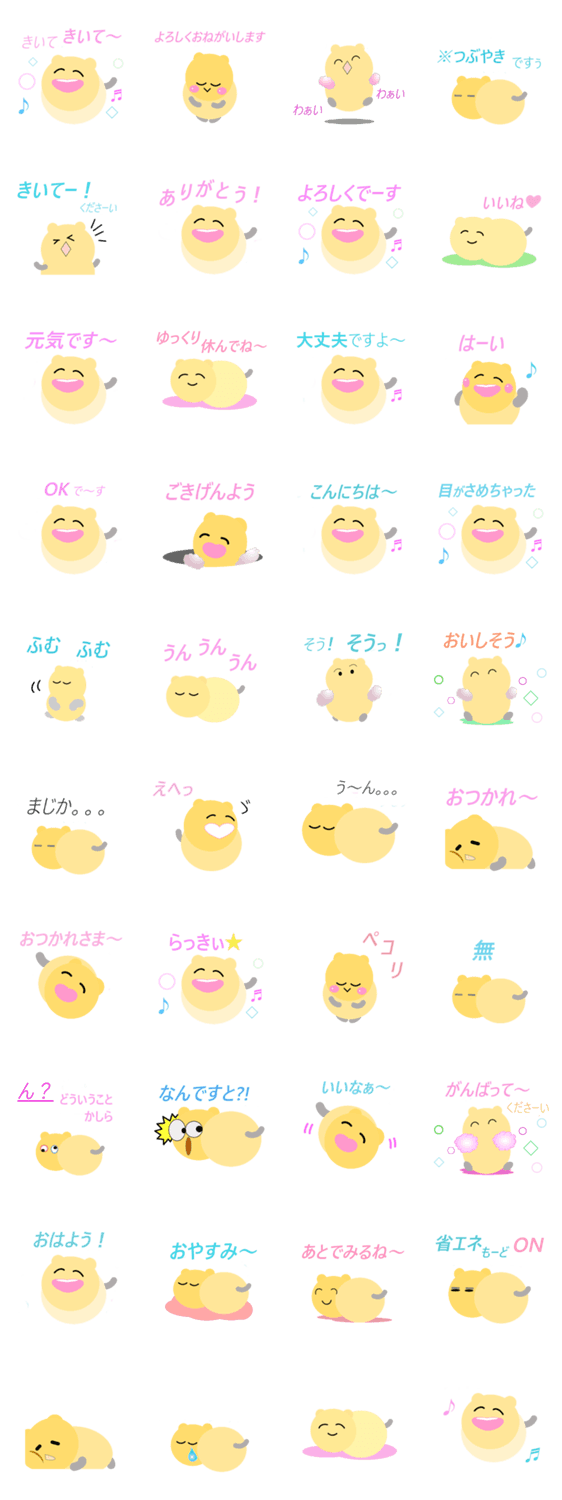 | スタンプ説明 | ゆるっとかわいいキャラが、毎日のあいさつやリアクションをお届け。 ほっこり気分になれるスタンプです(きいて、つぶやき、いいね、元気です、おいしそう、おつかれ) |