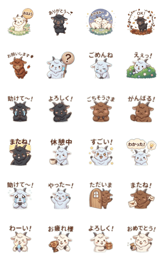 | スタンプ説明 | むさしファームのトカラヤギたちがスタンプに!白黒茶のヤギさんが日常会話を彩ります。ヤギ/山羊/動物/かわいい/ゆるかわ/ペット/挨拶/日常/農場/トカラヤギ/ギフト |