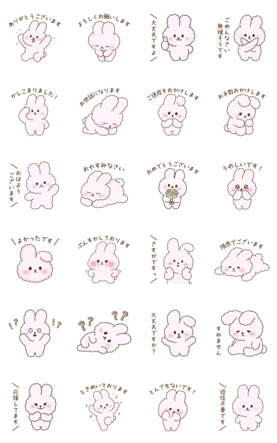 | スタンプ説明 | ふわもこうさぎの、ていねいでやさしい敬語スタンプ。毎日のトークに使いやすく、かわいく気持ちを伝えられます。職場でも使いやすい、ほっこり癒されるスタンプです。 |