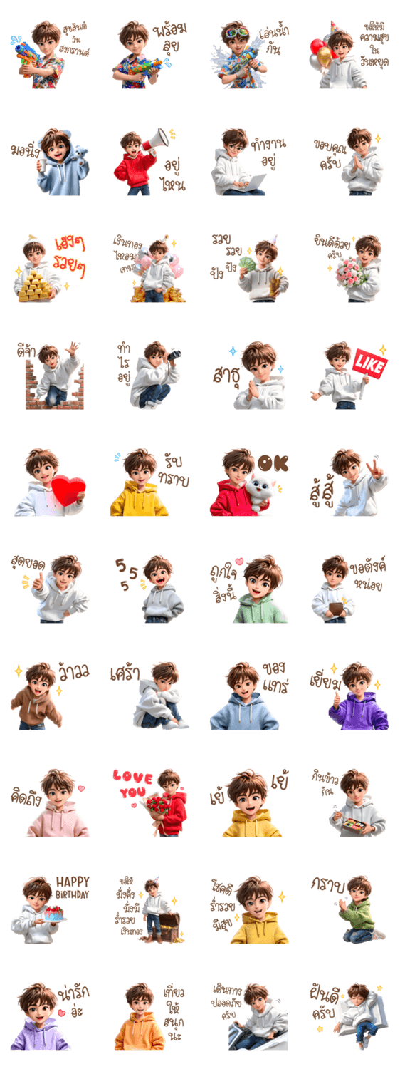| スタンプ説明 | Happy Songkran Day, Thai New Year's festival, Cute Handsome Boys, greetings, baby 3D, HBD Happy Birthday, Pastel Colors, Red, Pink, Purple, Green, Orange Colors |