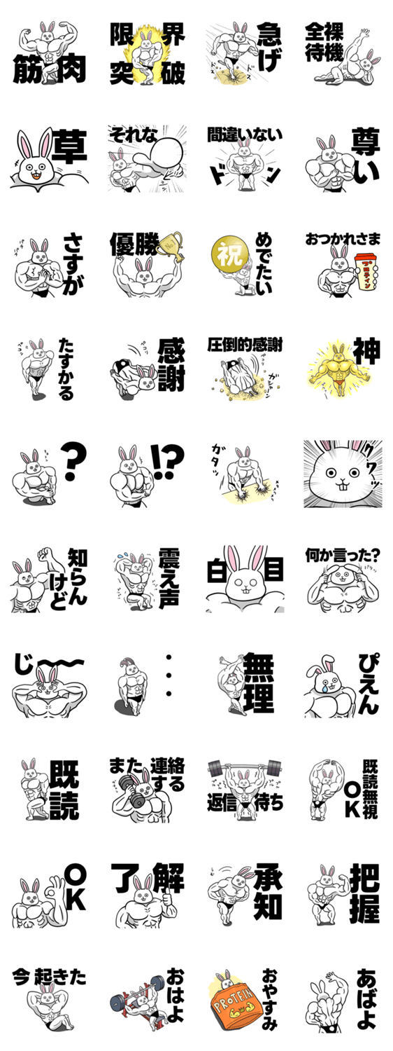 | スタンプ説明 | 見た目はバルクアップ、中身は丁寧。筋肉ムキムキマッチョなマッスル兎が日常の挨拶や返信を全力でサポート!シュールな筋肉美と使いやすさをお楽しみください。パワー! |