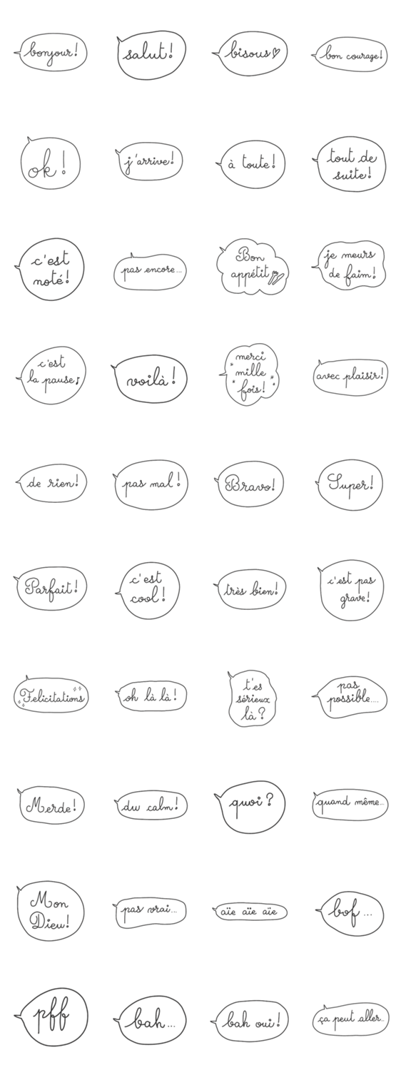 | スタンプ説明 | フランス人が書くスタイルの文字で、日常に使いやすいスタンプを作りました。毒も混ざってます(汗) |