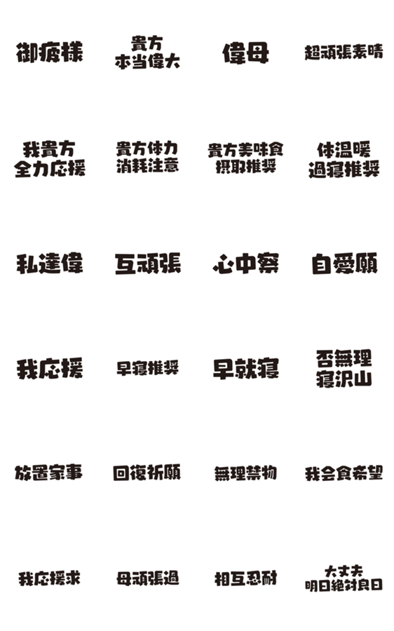 | スタンプ説明 | 子育て中ママ向けの漢字ネタ風スタンプ。 育児あるある、応援、労い系。 挨拶や返事、体調気遣いなど日常会話で使いやすい共感スタンプ。 ネタ シュール ママ友 連絡 |