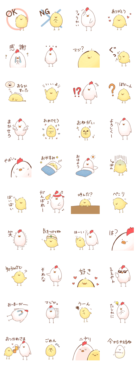 | スタンプ説明 | にわとりとひよこの毎日使える少しゆるめなかわいいスタンプです。 にわとり/ひよこ/毎日/日常/かわいい/シンプル/あいさつ/癒し/ずっと |