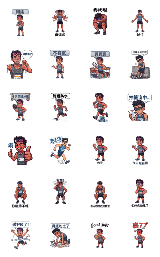 | スタンプ説明 | The post contains 16 images, featuring humorous dialogues among runners. |