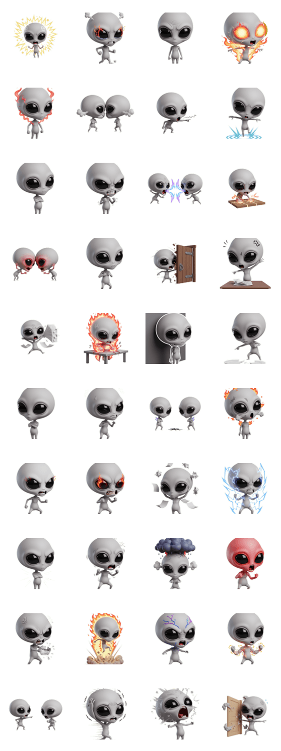 | スタンプ説明 | 地球の出来事にショックを受けたグレイ宇宙人のスタンプ。驚き、絶句、信じられない表情が満載で、ドン引きした時にぴったりです! |