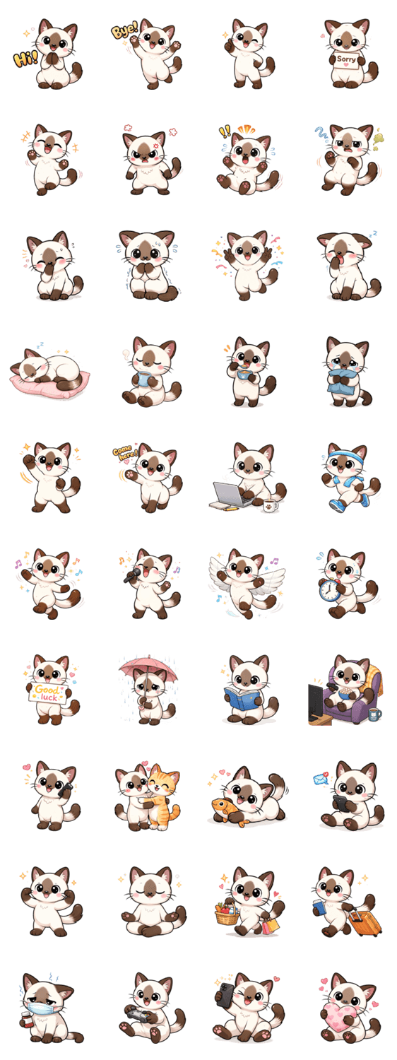 | スタンプ説明 | Adorable Siamese cat stickers featuring cute and expressive emotions for everyday chats. Perfect for greetings, thanks, apologies, and fun conversations. |