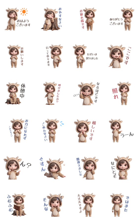 | スタンプ説明 | 3Dのぷにぷに質感がかわいい、子鹿の女の子日常スタンプです。恋人/カップル/ペア/友達/家族/挨拶/女の子/丁寧/着ぐるみ/動物/もふもふ/淡色女子シリーズ |