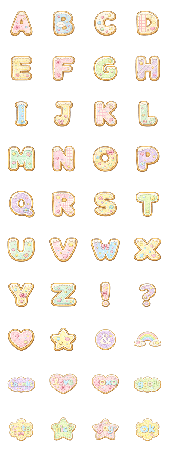 | スタンプ説明 | パステルカラーのゆるかわクッキーの英字スタンプ。あいさつや気持ちを伝えられて、写真に貼ってかわいくデコも楽しめます♡ |