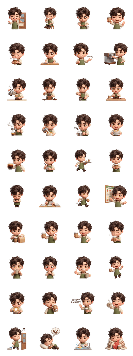 | スタンプ説明 | barista, cafe, coffee, cute, chibi, boy, profession, bright |