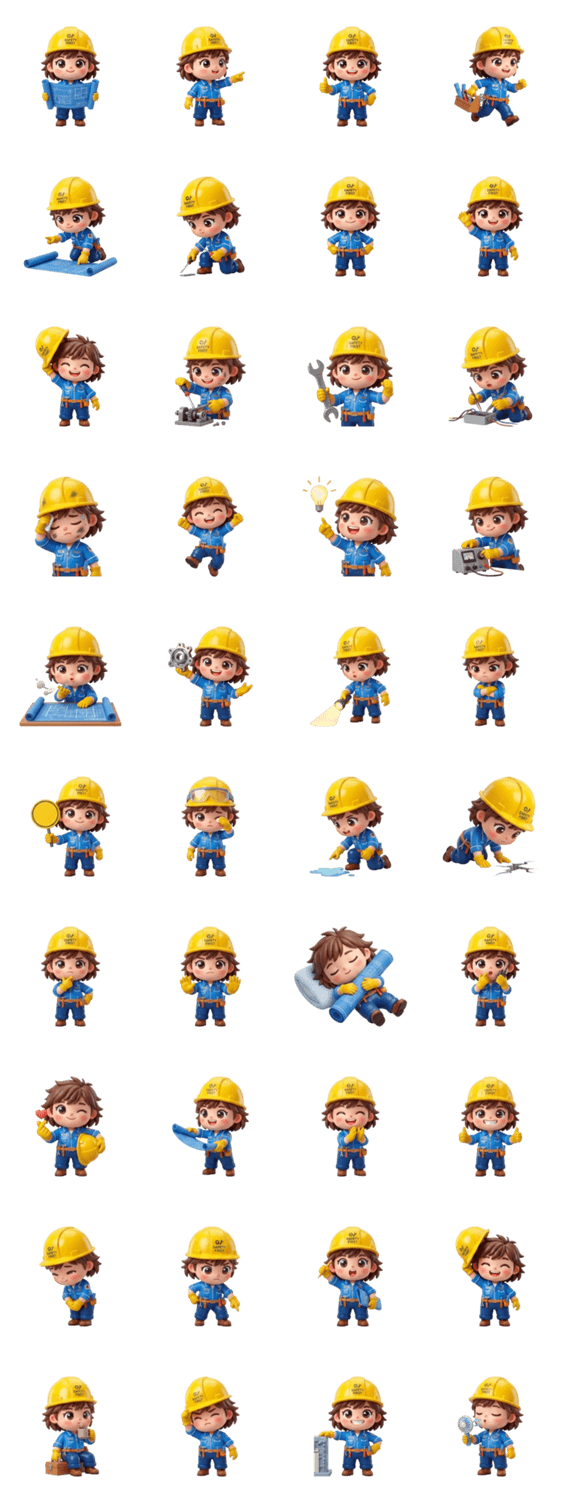 | スタンプ説明 | engineer, chibi, safety helmet, profession, cute, working, problem solving, energetic |