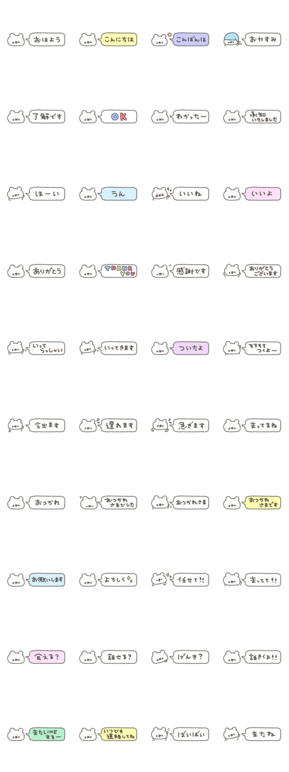 | スタンプ説明 | くまやん。のシンプルな吹き出しスタンプです。省スペースだから控えめにスタンプが送れます! |