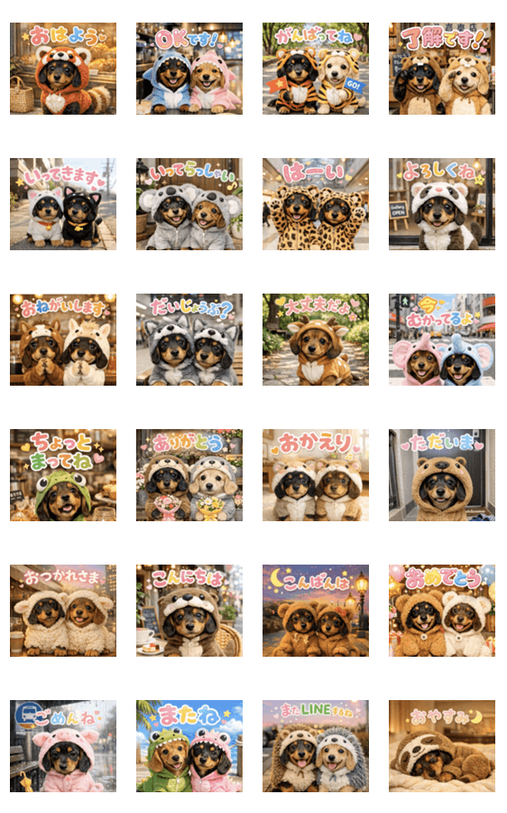 | スタンプ説明 | 可愛いダックスフントがいろんな動物に変身♪画面いっぱいに飛び出すポップアップスタンプです♡ダックスフンド/犬 |