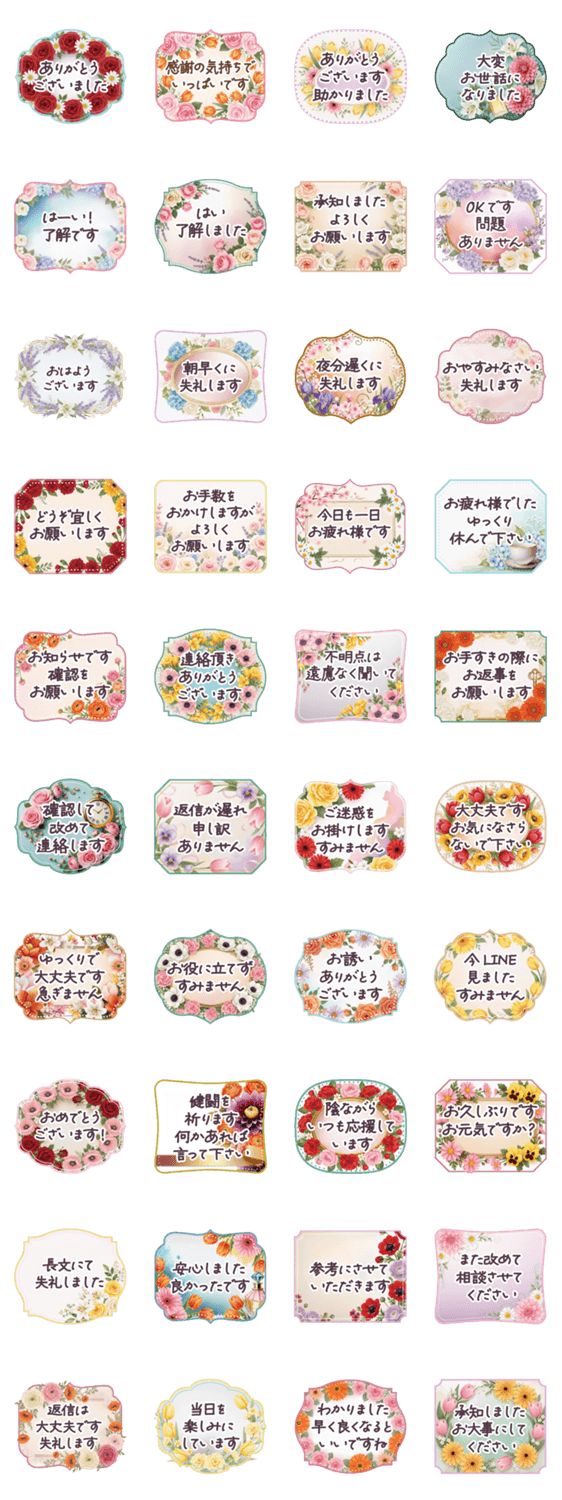 | スタンプ説明 | 長文挨拶が便利なお花カード風スタンプ。グループ/PTA/ママ友/先輩/友達/敬語/丁寧/挨拶/長文/お祝い/年度末/新年度/花/お花/ブーケ/あいさつ/メッセージカード |