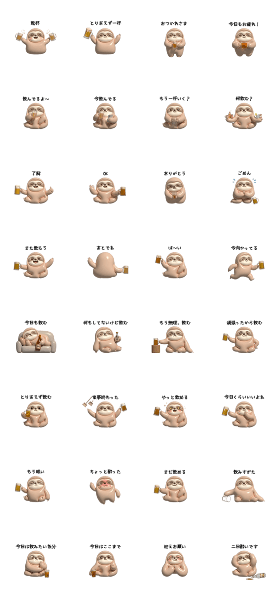 | スタンプ説明 | ぷくぷく可愛い見た目と、思わず使いたくなるお酒あるある満載のスタンプです。 「もう無理、飲む」「今日くらいいいよね」 そんな気持ちをゆる〜いなまけもので表現! |