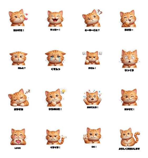 | スタンプ説明 | 茶トラ猫のキュートなキャラクターが日常で使う挨拶などのスタンプです |