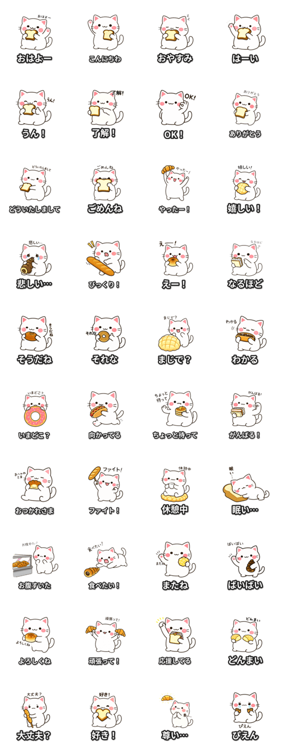 | スタンプ説明 | パンが大好きすぎる猫ちゃんの、ゆるくて可愛いスタンプです。 おいしいパンに目がないあなたの思いを代弁します。 はらぺこな猫と一緒に、トークをもっと美味しくしよう! |