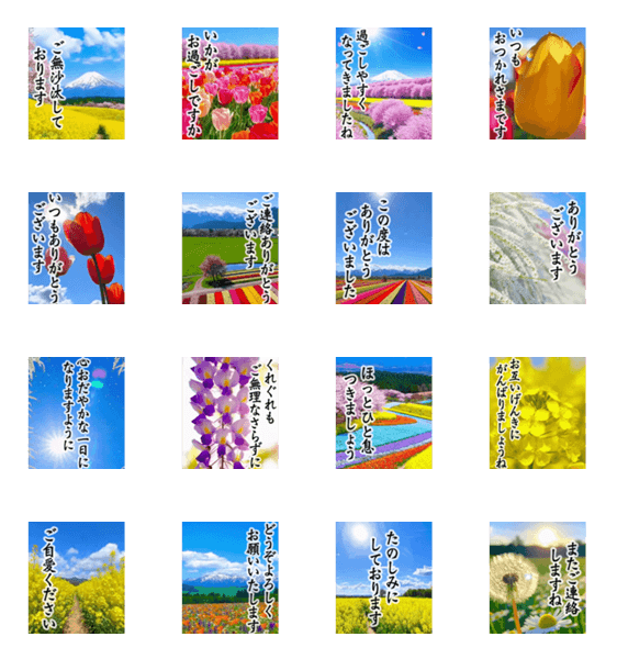 | スタンプ説明 | 背景に色とりどりの華やかな花一面の世界が広がります。ずっと使いやすい敬語・丁寧語のスタンプです♪くっきり文字で見やすく仕上げました。お疲れさま/ありがとう/富士山 |