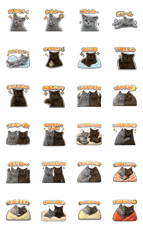 | スタンプ説明 | 飼い猫ノエルとチロルの癒し系スタンプです。 会話がなんとなくほっこりするようなスタンプのセットにしてみました。 スタンプ1つ送るだけでも、会話が成立するかも! |