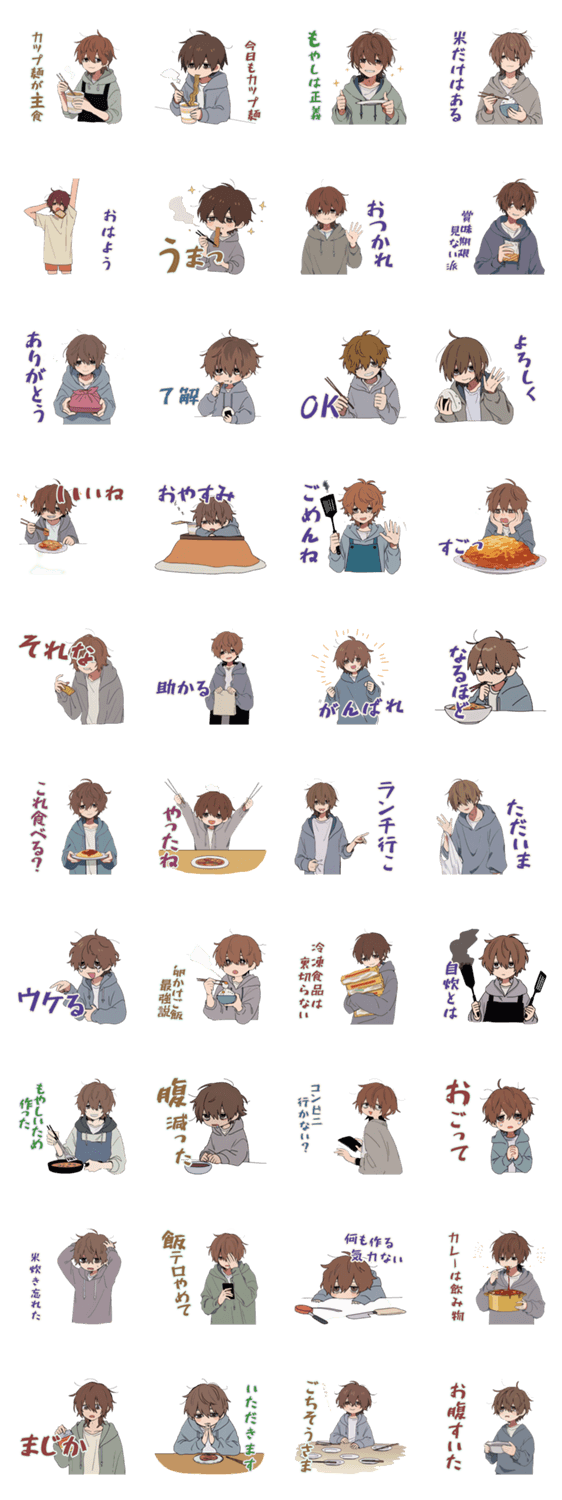 | スタンプ説明 | 自炊がんばる限界大学生スタンプ!カップ麺ともやしで生きる男子に/日常/挨拶/大学生/レポート/徹夜/単位/ゆるい/かわいい/男子/癒し/毎日使える/応援/友達 |