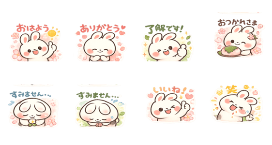 | スタンプ説明 | ふんわり可愛い「もちうさぎ」の春限定スタンプです。 桜や若葉をあしらった、毎日使いやすい敬語入りセット。 |