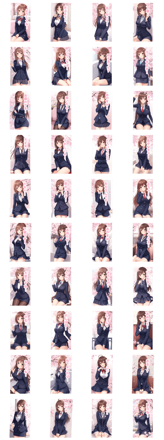 | スタンプ説明 | 会社員/社会人/仕事/女の子/かわいい/癒し/萌え/日常/挨拶/敬語/丁寧/大人かわいい/使いやすい/ガール/美少女/茶髪/ロングヘア/会話/返信/オフィス/通勤/スーツ/桜/花びら ※このスタンプはトークルームで大きく表示されるBIGスタンプです。 |