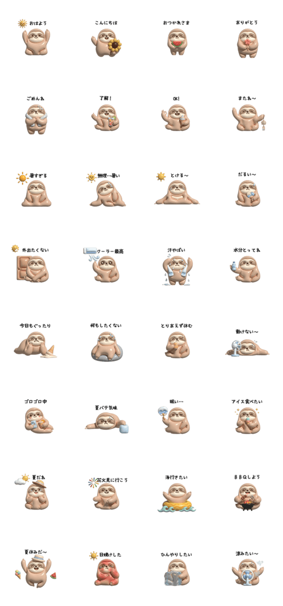 | スタンプ説明 | 暑すぎる毎日にぴったり! ぷくぷく可愛いなまけものが、夏の「あるある」をゆる〜く表現! 「暑すぎる」「クーラー最高」など、日常で使いやすいスタンプがたくさん♪ |