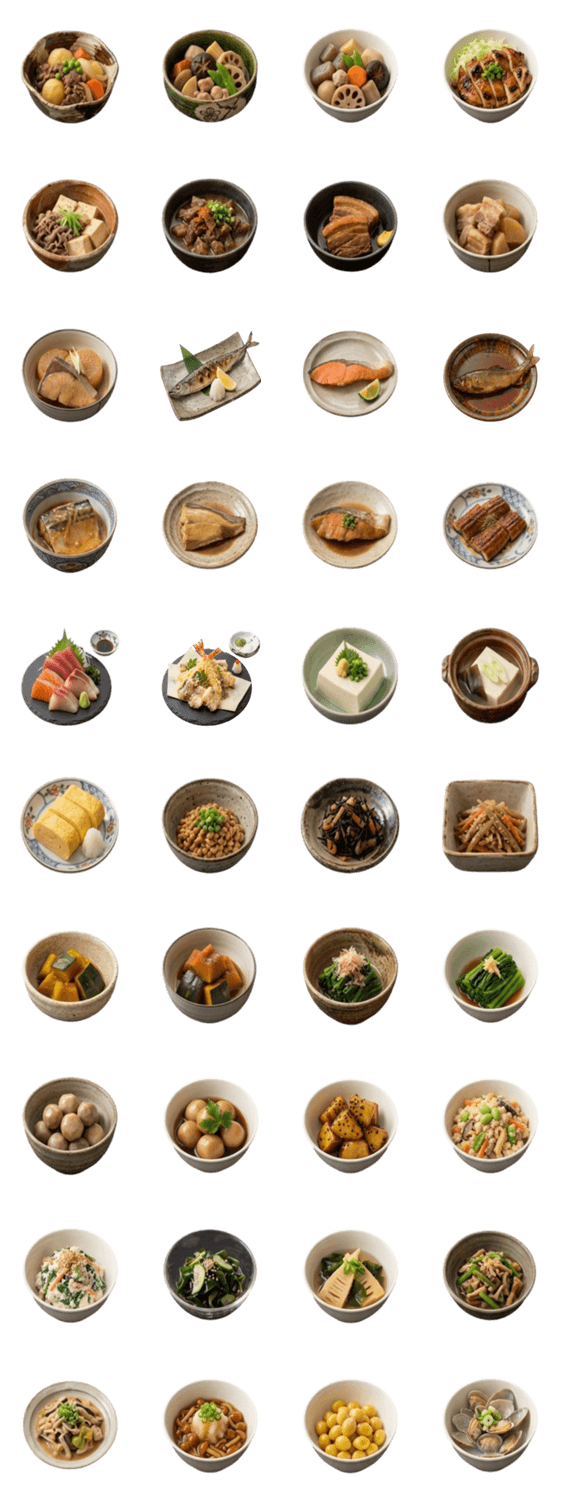 | スタンプ説明 | 実写みたいな日本料理。煮物・肉じゃが・筑前煮・豚の味噌焼き・肉豆腐・ぼっかけ・角煮・ぶり大根・焼き魚・焼き鮭・煮魚・サバの味噌煮・刺身・天ぷら・玉子焼き・納豆 |