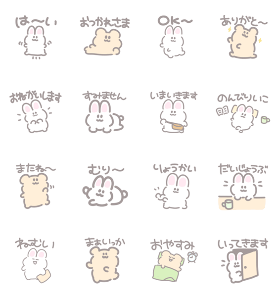 | スタンプ説明 | ふんわりかわいいうさぎとくまのスタンプです。 日常で使いやすい、やさしくてゆるい言葉を集めました。 |