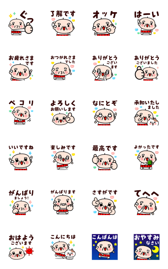 | スタンプ説明 | 了解です」「ありがとうございます」など、日常で使いやすい丁寧フレーズを、じいじ君が元気いっぱいにお届け!仕事でもプライベートでも大活躍!癒される敬語スタンプ。 |
