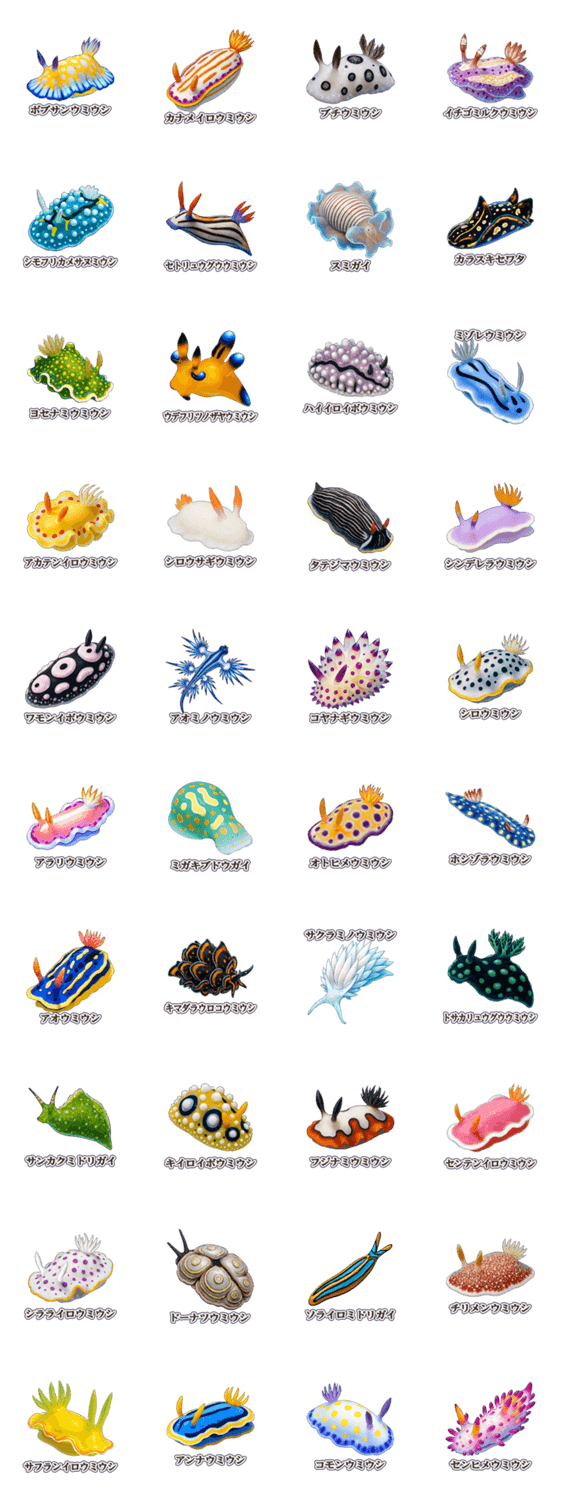 | スタンプ説明 | 海の妖精。カラフルで可愛いウミウシがいっぱい♪(ウミウシ/海/生き物/海洋/カラフル/可愛い/癒し/不思議/ダイビング/水族館/ナメクジウオ/軟体動物/幻想的/海の妖精/人気) |
