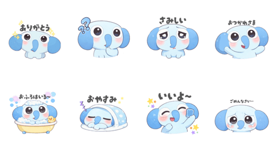 | スタンプ説明 | きゅるきゅるおめめのみずいろゾウさんのスタンプです。 |