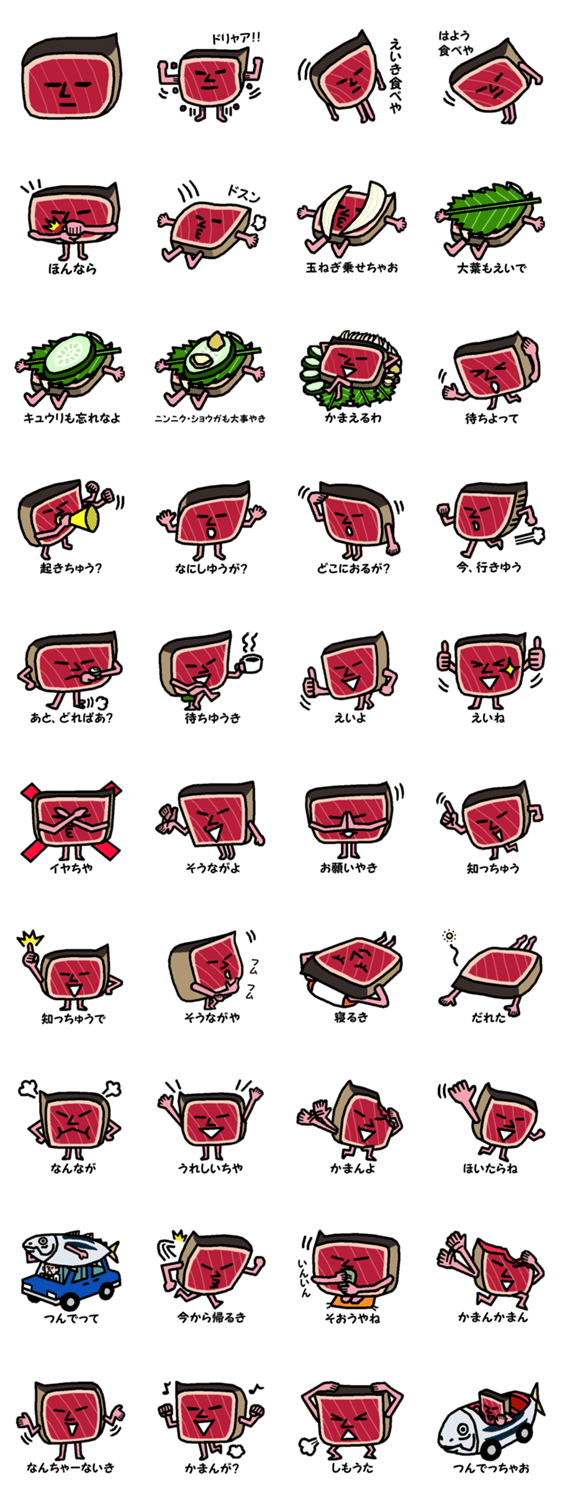 | スタンプ説明 | 高知県で有名な「カツオのたたき」がキャラクターに。土佐弁でお話します。 |