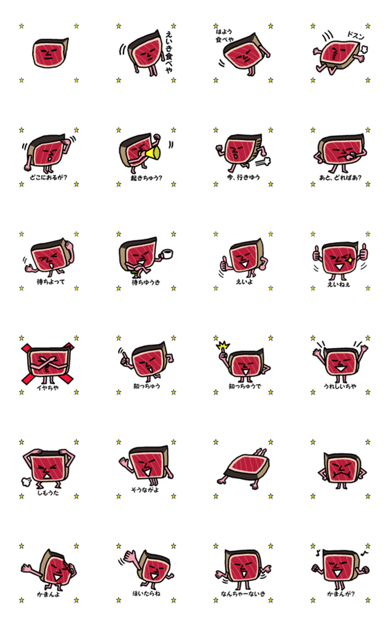 | スタンプ説明 | 高知県の有名な食べ物「カツオのたたき」をキャラクターに。土佐弁のアニメーションスタンプです。 |