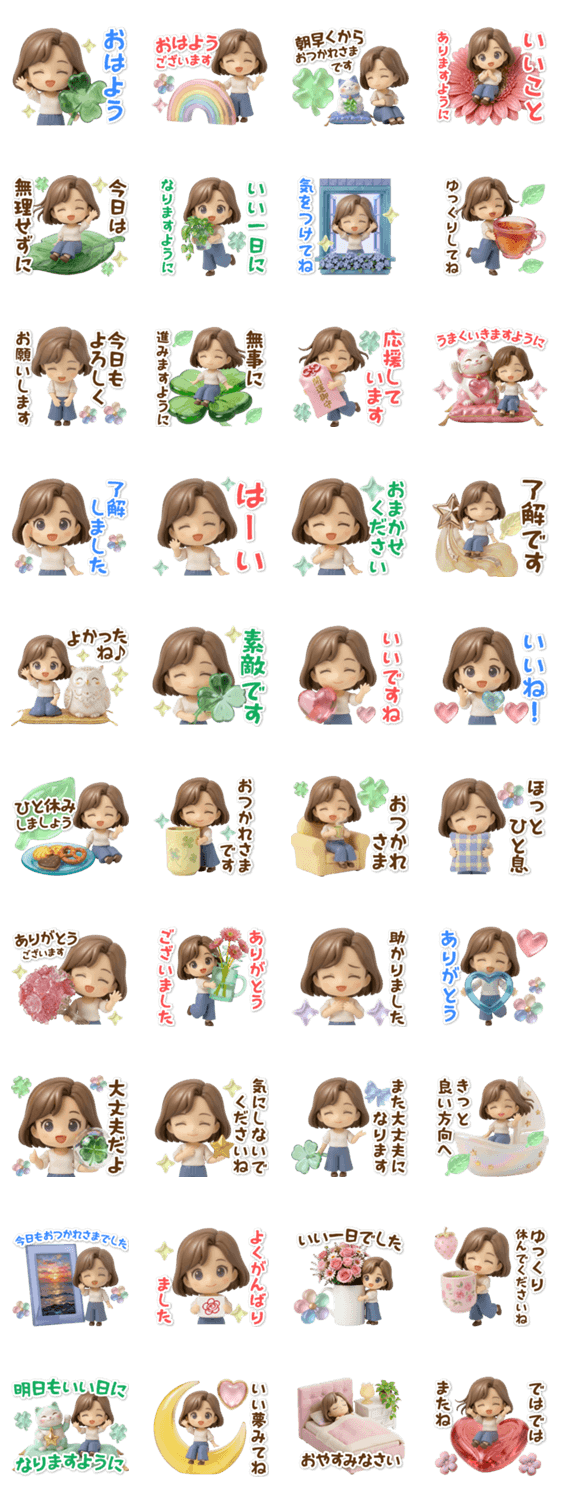 | スタンプ説明 | 大人の女性に♪透明感のあるクローバーやハートで幸運&日常を届けます♡おはよう・おつかれさま等挨拶、応援や気遣い言葉♪開運/敬語/グリーン/緑/癒し/ママ友/女の子/主婦 |