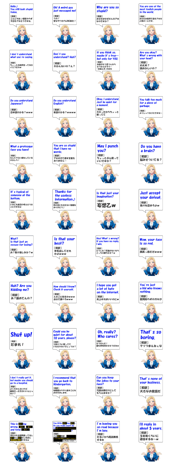 | スタンプ説明 | 毒舌/辛口/煽る/煽り/悪口/和訳翻訳/むかつく/うざい/バカ/馬鹿/アホ/英語/英会話/辛辣/口が悪い/罵る/金髪/外国人/英語教師/ELT/先生/中学校/高校/英文法/英単語/教育学習 ※このスタンプはトークルームで大きく表示されるBIGスタンプです。 |