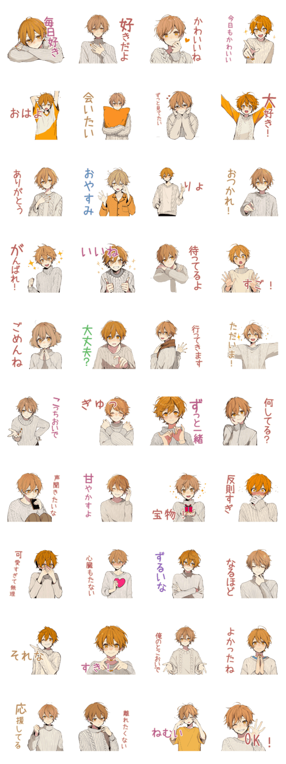 | スタンプ説明 | 甘い彼氏が毎日愛を届けます!恋人やカップルにオススメ/甘い/彼氏/恋人/カップル/デレデレ/日常/挨拶/癒し/かわいい/男子/応援/大人/萌え/毎日使える/好き |