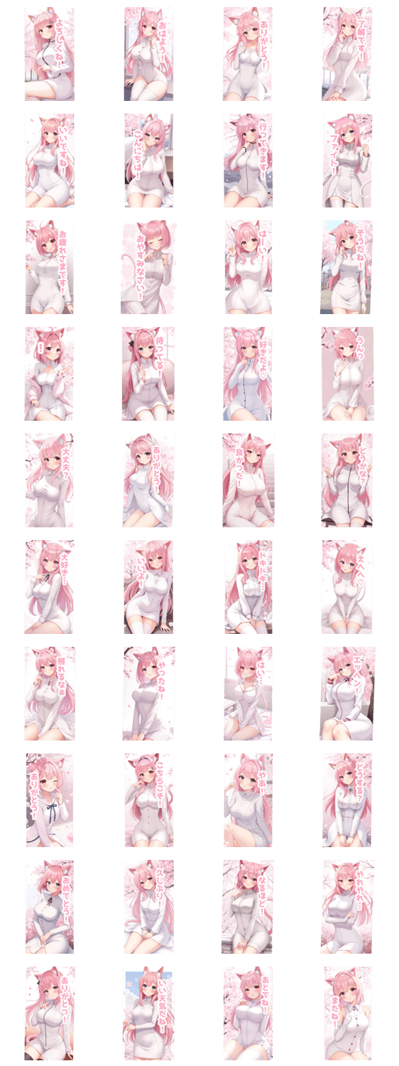 | スタンプ説明 | ホワイト/クール/キュート/女の子/女子/かわいい/癒し/萌え/日常/挨拶/使いやすい/JK/美少女/ロングヘア/白スーツ/会話/返信/ピンク髪/生活/女子高生/高校生/猫耳 ※このスタンプはトークルームで大きく表示されるBIGスタンプです。 |