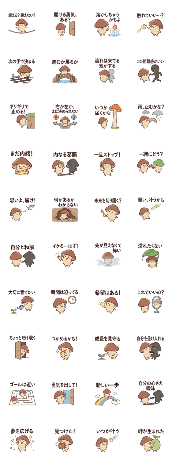 | スタンプ説明 | 踏み込む直前の緊張感や様子見の状況で使えるキノコ。曖昧な関係の進展や会話の主導権を握る心理戦、意味深な日常の返信に。匂わせたい相手に。 |